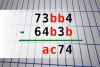 If 73bb4 - 64b3b = ac74 find number abc. Multiple solutions may exist. Correct answers: 0