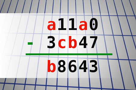 If a11a0 - 3cb47 = b8643 find number abc. Multiple solutions may exist.
