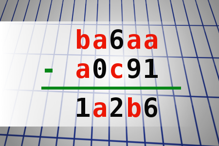 If ba6aa - a0c91 = 1a2b6 find number abc. Multiple solutions may exist.