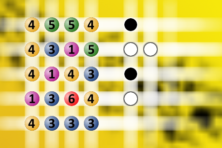 The computer chose a secret code (sequence of 4 digits from 1 to 6). Your goal is to find that code. Black circles indicate the number of hits on the right spot. White circles indicate the number of hits on the wrong spot.