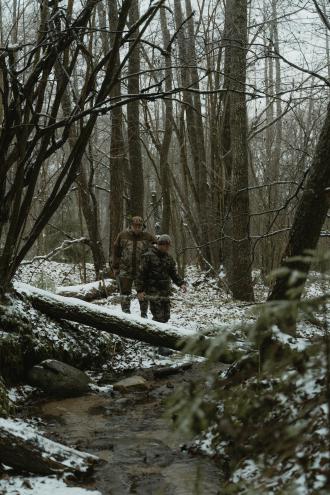 Two inexperienced hunters are out in the woods, and after a while they come upon some tracks.