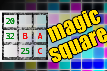 The aim is to place the some numbers from the list (5, 6, 11, 19, 20, 25, 26, 27, 28, 32) into the empty squares and squares marked with A, B an C. Sum of each row and column should be equal. All the numbers of the magic square must be different. Find values for A, B, and C. Solution is A-B+C.Correct answers: 0