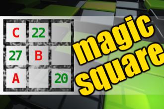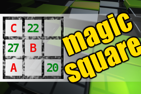 The aim is to place the some numbers from the list (11, 13, 16, 18, 20, 22, 27, 57, 59, 64) into the empty squares and squares marked with A, B an C. Sum of each row and column should be equal. All the numbers of the magic square must be different. Find values for A, B, and C. Solution is A-B*C.Correct answers: 0