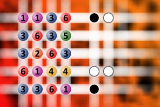 The computer chose a secret code (sequence of 4 digits from 1 to 6). Your goal is to find that code. Black circles indicate the number of hits on the right spot. White circles indicate the number of hits on the wrong spot.Correct answers: 0