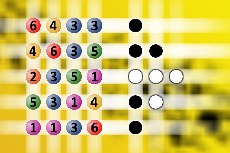 The computer chose a secret code (sequence of 4 digits from 1 to 6). Your goal is to find that code. Black circles indicate the number of hits on the right spot. White circles indicate the number of hits on the wrong spot.Correct answers: 0