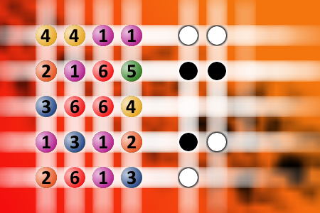 The computer chose a secret code (sequence of 4 digits from 1 to 6). Your goal is to find that code. Black circles indicate the number of hits on the right spot. White circles indicate the number of hits on the wrong spot.