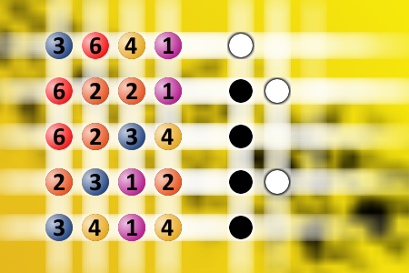 The computer chose a secret code (sequence of 4 digits from 1 to 6). Your goal is to find that code. Black circles indicate the number of hits on the right spot. White circles indicate the number of hits on the wrong spot.