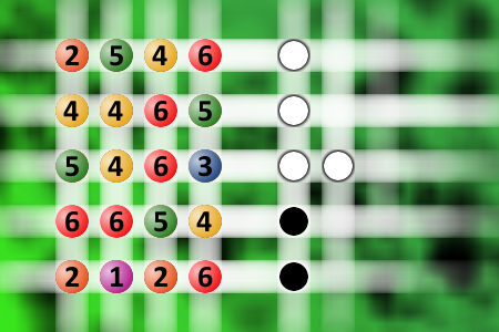 The computer chose a secret code (sequence of 4 digits from 1 to 6). Your goal is to find that code. Black circles indicate the number of hits on the right spot. White circles indicate the number of hits on the wrong spot.Correct answers: 0