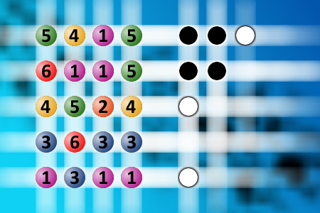 The computer chose a secret code (sequence of 4 digits from 1 to 6). Your goal is to find that code. Black circles indicate the number of hits on the right spot. White circles indicate the number of hits on the wrong spot.