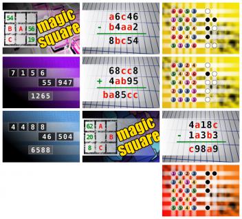 ● The computer chose a secret code (sequence of 4 digits from 1 to 6). Your goal is to find that code. Black circles indicate the number of hits on the right spot. White circles indicate the number of hits on the wrong spot. ● NUMBERMANIA: Calculate the number 6588 using numbers [4, 4, 8, 8, 46, 504] and basic arithmetic operations (+, -, *, /). Each of the numbers can be used only once. ● The aim is to place the some numbers from the list (2, 6, 8, 9, 17, 19, 20, 62, 64, 65) into the empty squares and squares marked with A, B an C. Sum of each row and column should be equal. All the numbers of the magic square must be different. Find values for A, B, and C. Solution is A+B*C. ● If 4a18c - 1a3b3 = c98a9 find number abc. Multiple solutions may exist. ● The computer chose a secret code (sequence of 4 digits from 1 to 6). Your goal is to find that code. Black circles indicate the number of hits on the right spot. White circles indicate the number of hits on the wrong spot. ● NUMBERMANIA: Calculate the number 7328 using numbers [5, 5, 3, 3, 98, 819] and basic arithmetic operations (+, -, *, /). Each of the numbers can be used only once. ● If 7b0a8 + 544ab = cb65a0 find number abc. Multiple solutions may exist. ● The computer chose a secret code (sequence of 4 digits from 1 to 6). Your goal is to find that code. Black circles indicate the number of hits on the right spot. White circles indicate the number of hits on the wrong spot. ● NUMBERMANIA: Calculate the number 1085 using numbers [8, 1, 6, 6, 51, 677] and basic arithmetic operations (+, -, *, /). Each of the numbers can be used only once. ● The aim is to place the some numbers from the list (11, 13, 16, 18, 20, 22, 27, 57, 59, 64) into the empty squares and squares marked with A, B an C. Sum of each row and column should be equal. All the numbers of the magic square must be different. Find values for A, B, and C. Solution is A-B*C.