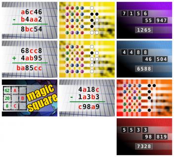 ● The computer chose a secret code (sequence of 4 digits from 1 to 6). Your goal is to find that code. Black circles indicate the number of hits on the right spot. White circles indicate the number of hits on the wrong spot. ● NUMBERMANIA: Calculate the number 6588 using numbers [4, 4, 8, 8, 46, 504] and basic arithmetic operations (+, -, *, /). Each of the numbers can be used only once. ● The aim is to place the some numbers from the list (2, 6, 8, 9, 17, 19, 20, 62, 64, 65) into the empty squares and squares marked with A, B an C. Sum of each row and column should be equal. All the numbers of the magic square must be different. Find values for A, B, and C. Solution is A+B*C. ● If 4a18c - 1a3b3 = c98a9 find number abc. Multiple solutions may exist. ● The computer chose a secret code (sequence of 4 digits from 1 to 6). Your goal is to find that code. Black circles indicate the number of hits on the right spot. White circles indicate the number of hits on the wrong spot. ● NUMBERMANIA: Calculate the number 7328 using numbers [5, 5, 3, 3, 98, 819] and basic arithmetic operations (+, -, *, /). Each of the numbers can be used only once. ● If 7b0a8 + 544ab = cb65a0 find number abc. Multiple solutions may exist. ● The computer chose a secret code (sequence of 4 digits from 1 to 6). Your goal is to find that code. Black circles indicate the number of hits on the right spot. White circles indicate the number of hits on the wrong spot. ● NUMBERMANIA: Calculate the number 1085 using numbers [8, 1, 6, 6, 51, 677] and basic arithmetic operations (+, -, *, /). Each of the numbers can be used only once. ● The aim is to place the some numbers from the list (11, 13, 16, 18, 20, 22, 27, 57, 59, 64) into the empty squares and squares marked with A, B an C. Sum of each row and column should be equal. All the numbers of the magic square must be different. Find values for A, B, and C. Solution is A-B*C.