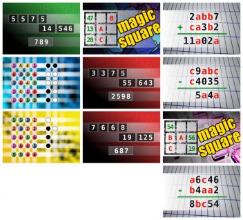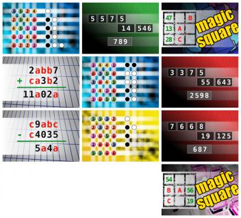 ● The computer chose a secret code (sequence of 4 digits from 1 to 6). Your goal is to find that code. Black circles indicate the number of hits on the right spot. White circles indicate the number of hits on the wrong spot. ● NUMBERMANIA: Calculate the number 789 using numbers [5, 5, 7, 5, 14, 546] and basic arithmetic operations (+, -, *, /). Each of the numbers can be used only once. ● The aim is to place the some numbers from the list (2, 5, 8, 13, 16, 28, 31, 32, 36, 44, 47, 52, 73) into the empty squares and squares marked with A, B an C. Sum of each row and column should be equal. All the numbers of the magic square must be different. Find values for A, B, and C. Solution is A+B+C. ● If 2abb7 + ca3b2 = 11a02a find number abc. Multiple solutions may exist. ● The computer chose a secret code (sequence of 4 digits from 1 to 6). Your goal is to find that code. Black circles indicate the number of hits on the right spot. White circles indicate the number of hits on the wrong spot. ● NUMBERMANIA: Calculate the number 2598 using numbers [3, 3, 7, 5, 55, 643] and basic arithmetic operations (+, -, *, /). Each of the numbers can be used only once. ● If c9abc - c4035 = 5a4a find number abc. Multiple solutions may exist. ● The computer chose a secret code (sequence of 4 digits from 1 to 6). Your goal is to find that code. Black circles indicate the number of hits on the right spot. White circles indicate the number of hits on the wrong spot. ● NUMBERMANIA: Calculate the number 687 using numbers [7, 6, 6, 8, 19, 125] and basic arithmetic operations (+, -, *, /). Each of the numbers can be used only once. ● The aim is to place the some numbers from the list (18, 19, 20, 21, 22, 28, 29, 54, 56, 63, 72) into the empty squares and squares marked with A, B an C. Sum of each row and column should be equal. All the numbers of the magic square must be different. Find values for A, B, and C. Solution is A-B-C.